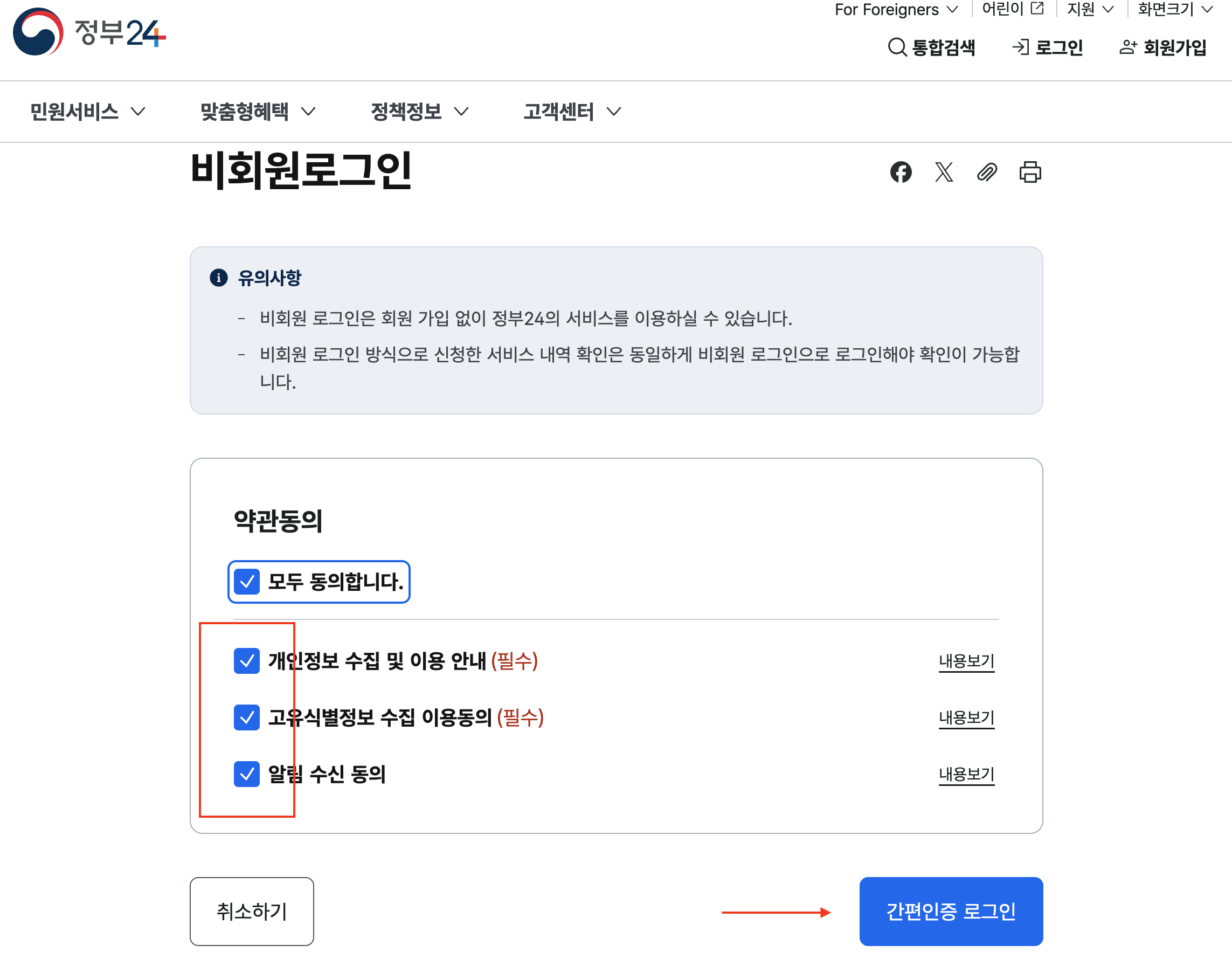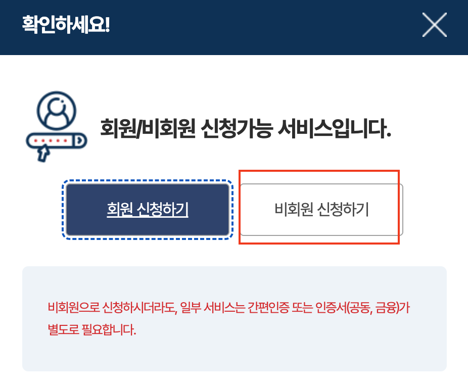 - 4단계: '신청하기' 버튼 클릭 후 로그인 (공동인증서 또는 간편인증 가능)