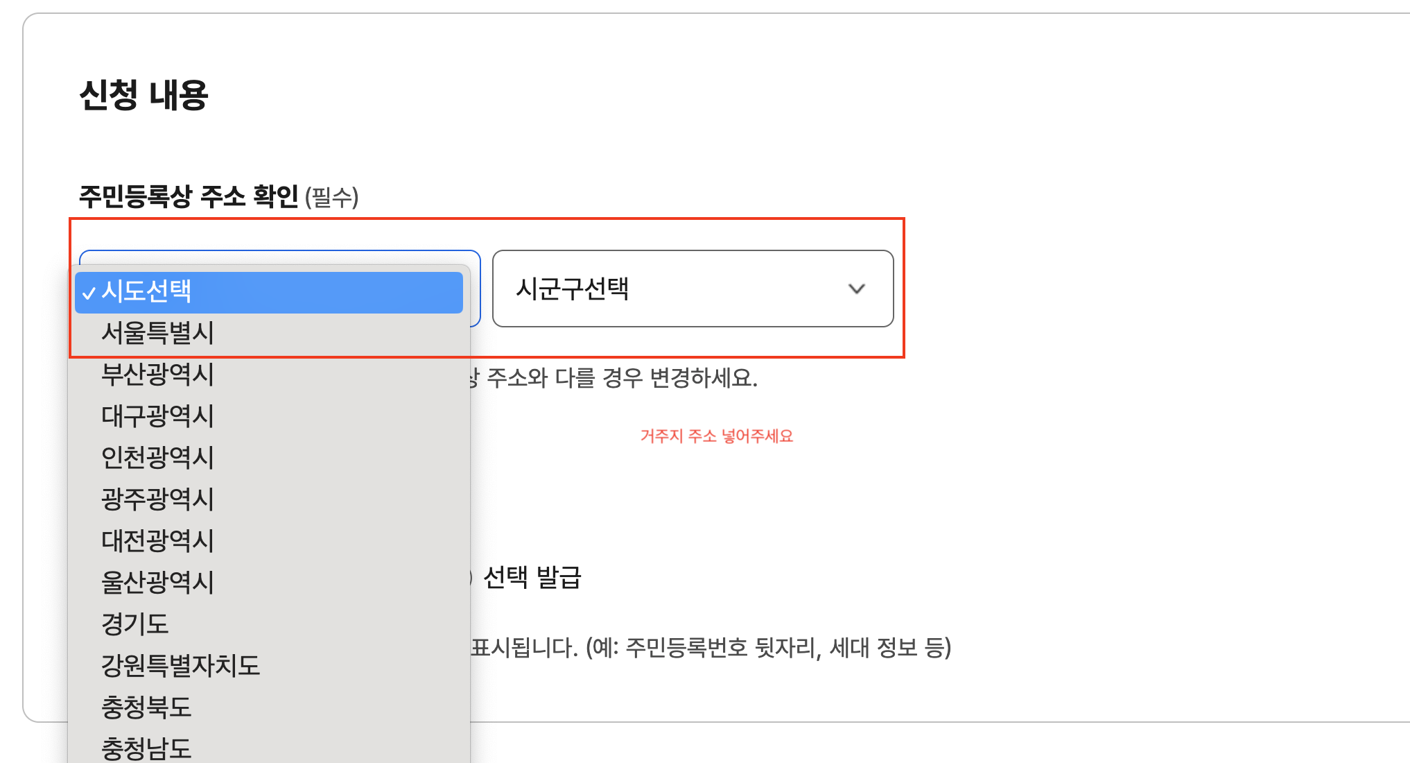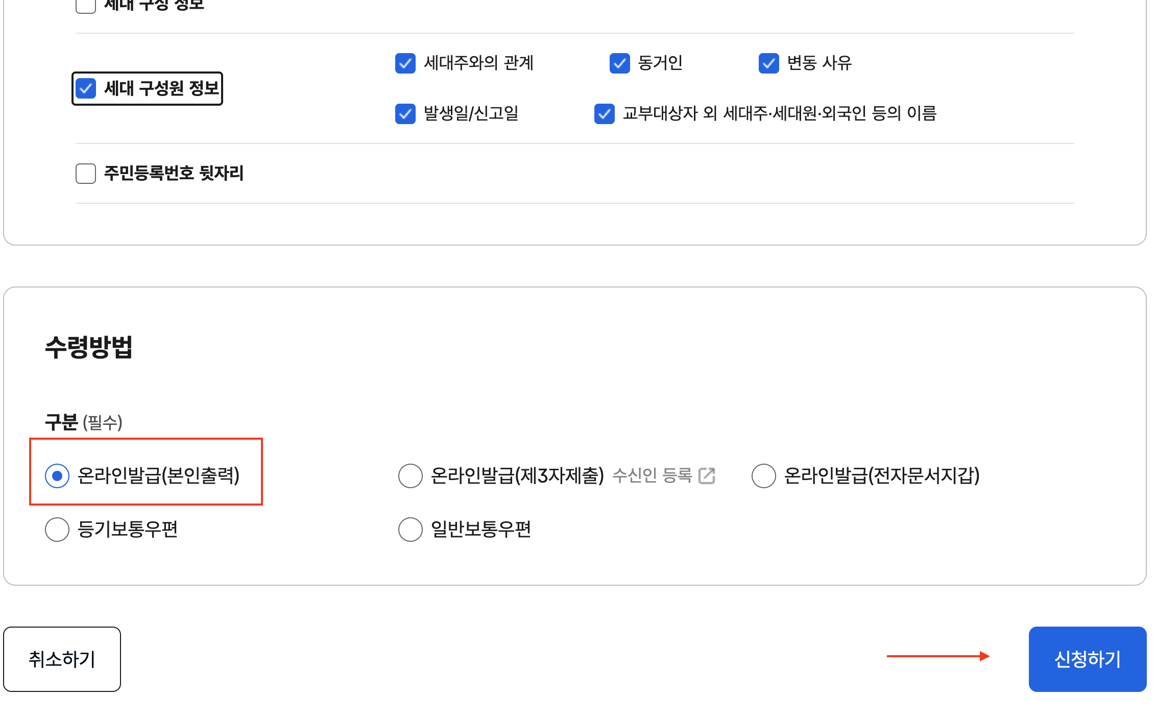 - 다른 사람과 세대를 같이 구성하고 있다면 발급 시 유의하여 세대원 포함 여부 설정