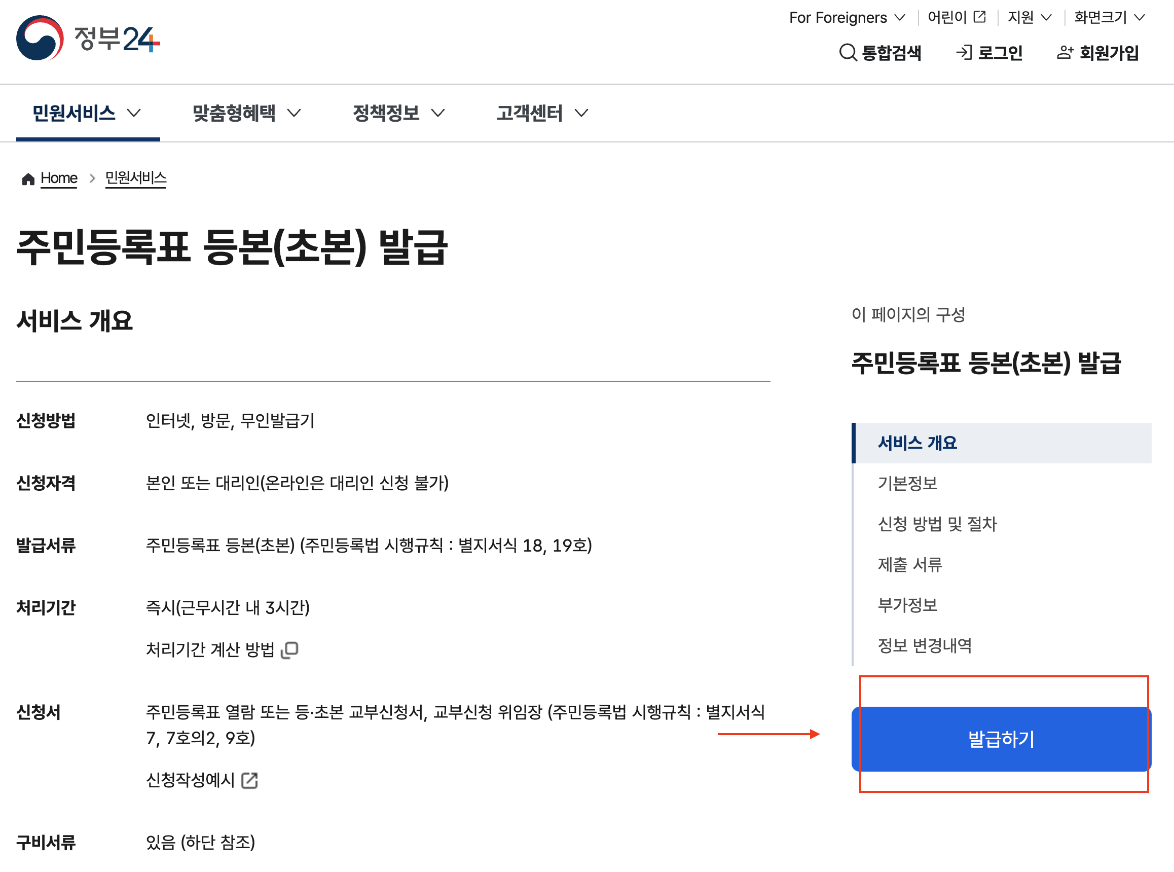 - 3단계: '주민등록표 등본(초본)교부' 클릭